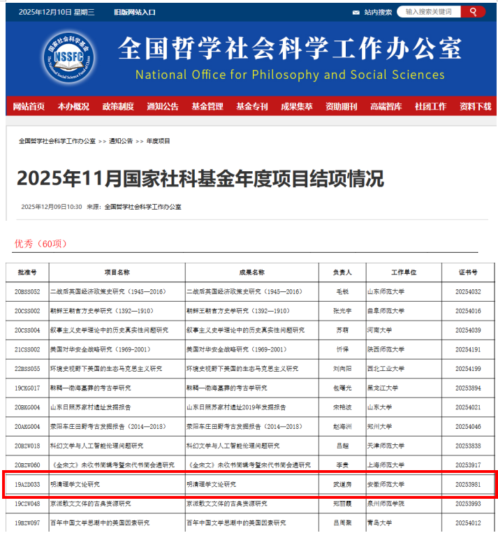 近日,全国哲学社会科学工作办公室公布了2025年11月国家社科基金年度项目结项名单,中国诗学研究中心副主任武道房教授2019年获批立项的国家社科基金重点项目“明清理学文论研究”(项目批准号:19AZD033)顺利通过结项验收,结项证书号为20253981,结项等级为优秀。