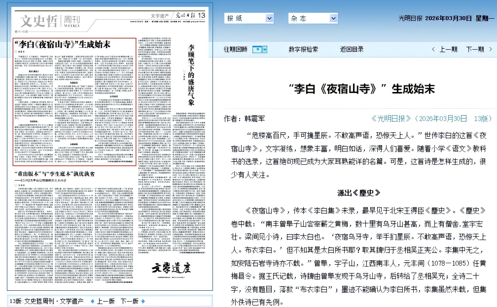 3月30日,《光明日报》第13版“文史哲周刊•文学遗产”刊发中国诗学研究中心韩震军教授文章《“李白<夜宿山寺>”生成始末》。