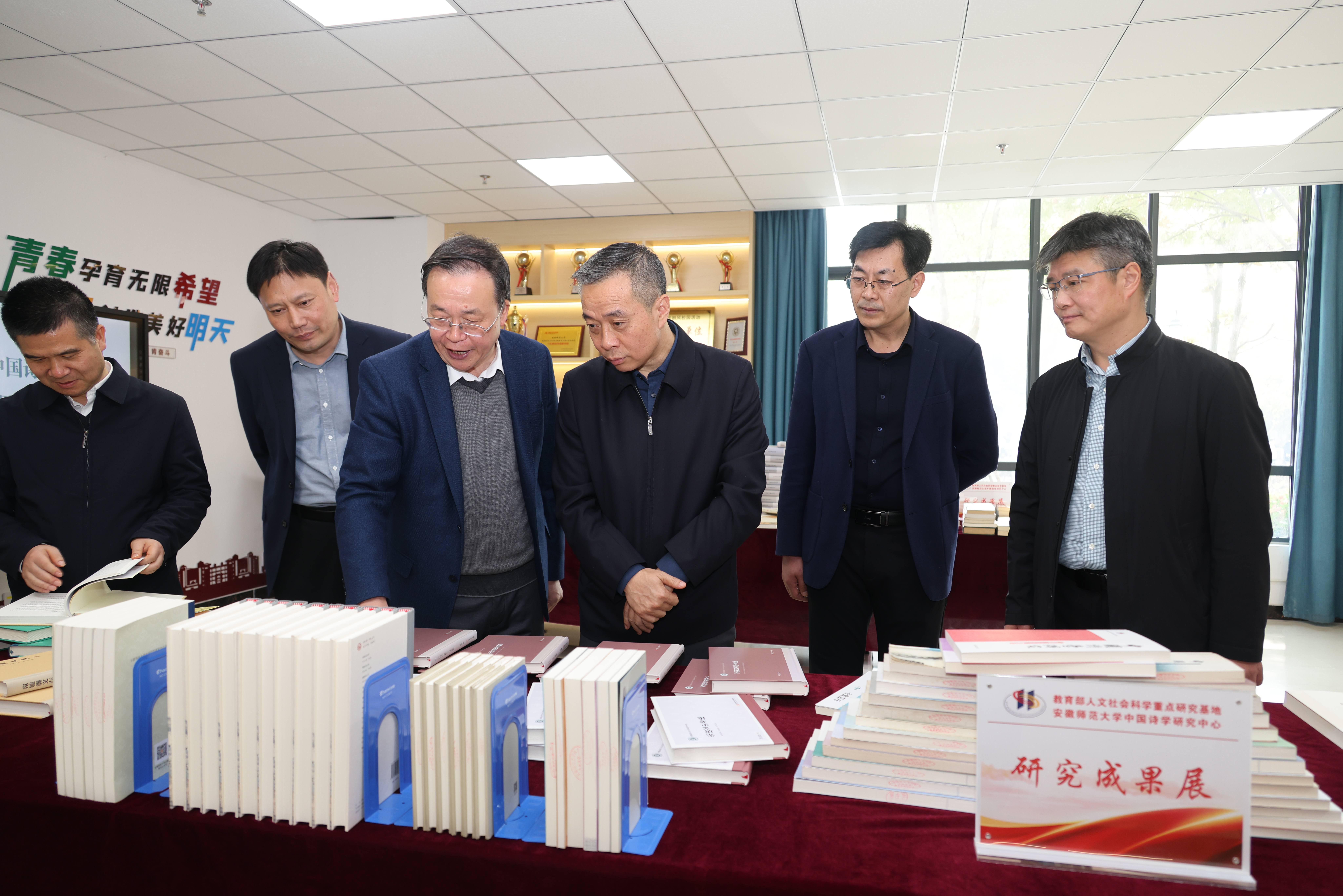 康教授在调研中观看了文学院文化墙,项念东院长介绍了学院的发展历程、资深专家学者以及人才培养等方面取得的成绩;随后,康教授参观了教育部人文社会科学重点研究基地安徽师范大学中国诗学研究中心成果展,胡传志主任在简要介绍基地办公环境、人员配置、藏书资源、学术交流与社会服务等情况的基础上,重点汇报了基地近年来开展的科研工作与取得的重要成果。康教授对文学院、中国诗学研究中心开展的工作和取得的成绩给予了高度好评,认为文学院和基地底蕴深厚、名家辈出,近些年潜心育人才、扎实做科研,取得的成果喜人、发展前景可期。