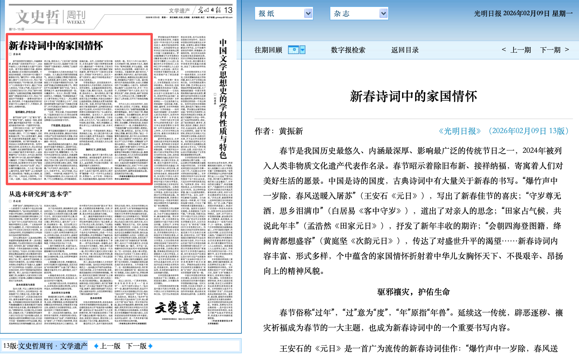 2月9日,《光明日报》第13版“文史哲周刊•文学遗产”刊发中国诗学研究中心副研究员黄振新老师文章《新春诗词中的家国情怀》。